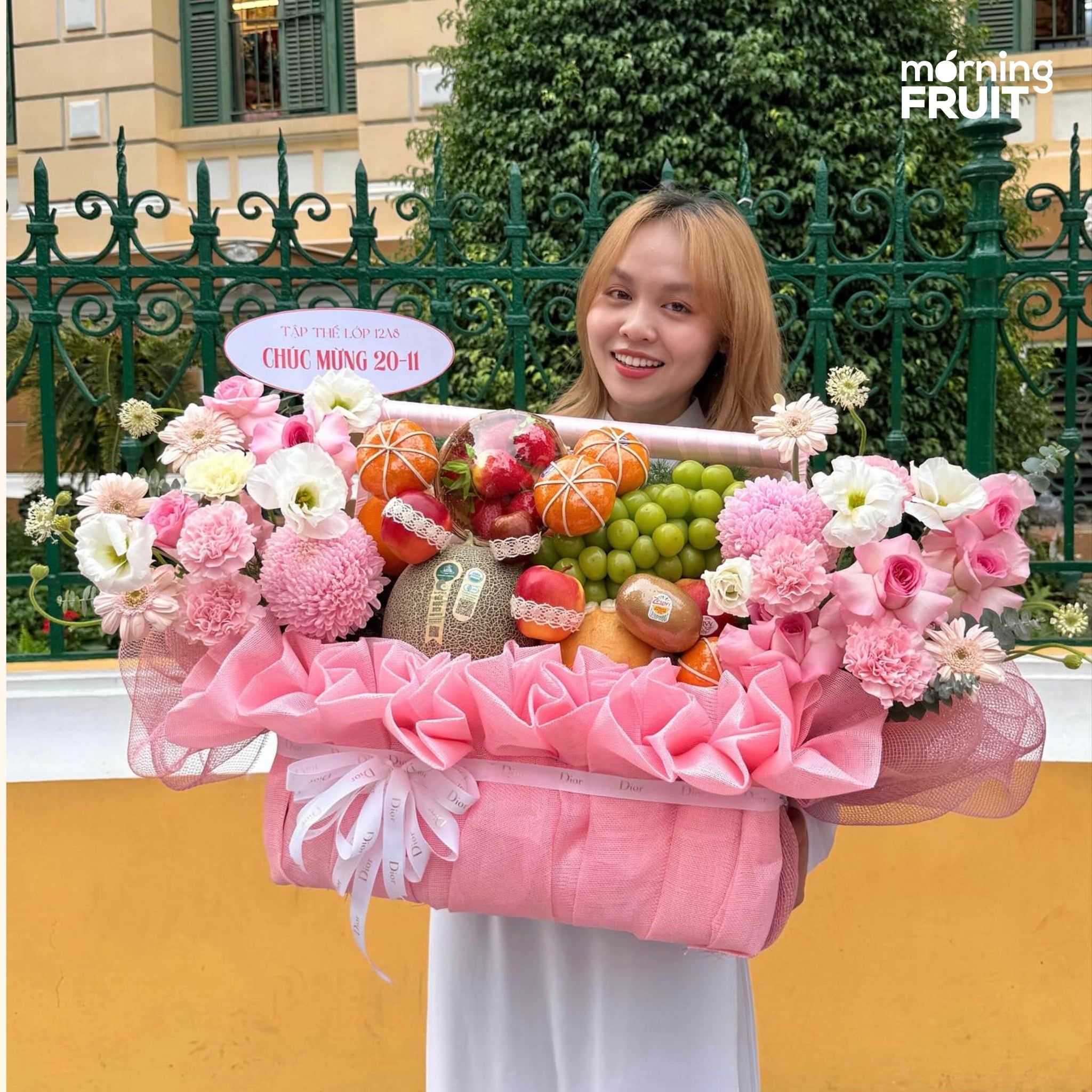 - Trái cây nhập khẩu thượng hạng kết hợp cùng hoa tươi cao cấp, mang đến vẻ đẹp hài hòa giữa giá trị thẩm mỹ và giá trị sử dụng. Đi kèm lưới và ruy băng trang trí bồng bềnh, tôn lên vẻ đẳng cấp cho món quà.