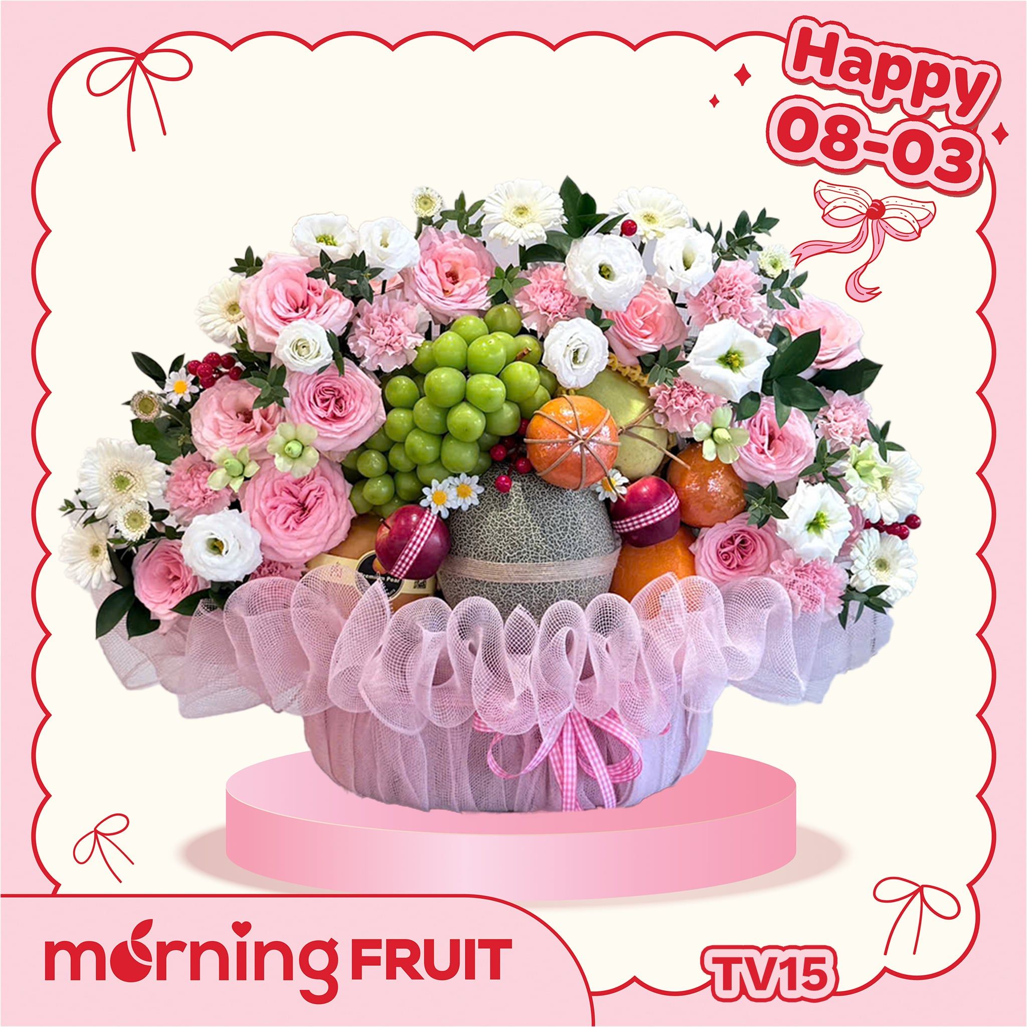 - Trái cây nhập khẩu thượng hạng kết hợp cùng hoa tươi cao cấp, mang đến vẻ đẹp hài hòa giữa giá trị thẩm mỹ và giá trị sử dụng. Đi kèm lưới và ruy băng trang trí bồng bềnh, tôn lên vẻ đẳng cấp cho món quà.