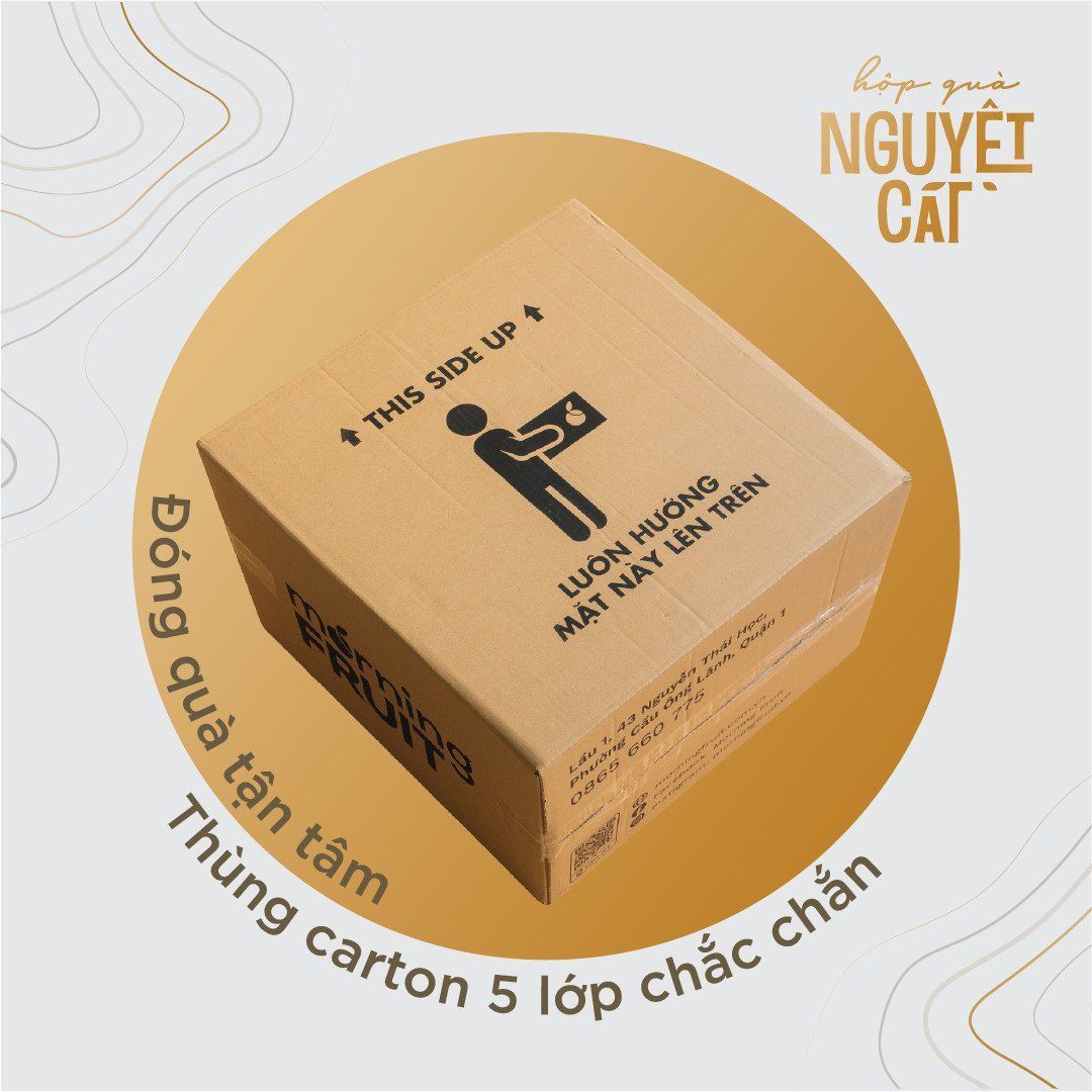 Quy cách bảo quản hộp quà: Hộp quà được bọc trong thùng carton dày 5 lớp khi vận chuyển để: - Giảm sốc - Hạn chế trái cây bị xô lệch trong hộp - Bảo vệ hộp khỏi các yếu tố về điều kiện thời tiết ảnh hưởng đến trái cây (nắng/mưa)