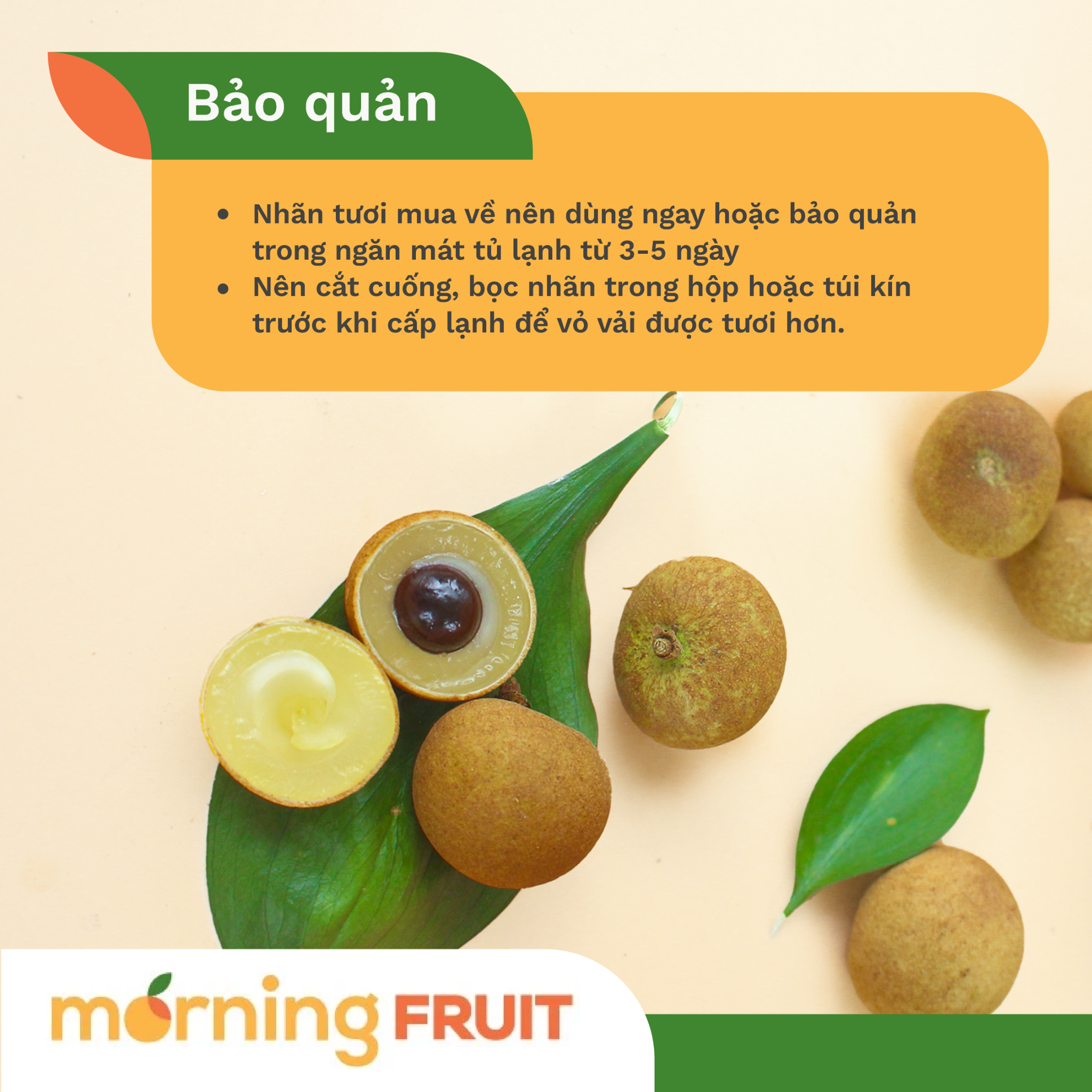 Bảo Quản Và Sử Dụng - Nhãn tươi mua về nên dùng ngay hoặc bảo quản trong ngăn mát tủ lạnh từ 3-5 ngày - Nên cắt cuống, bọc nhãn trong hộp hoặc túi kín trước khi cấp lạnh để vỏ vải được tươi hơn. - Loại bỏ những trái có dấu hiệu hư hỏng hoặc dập, mốc. Để tránh lan sang những trái khác.