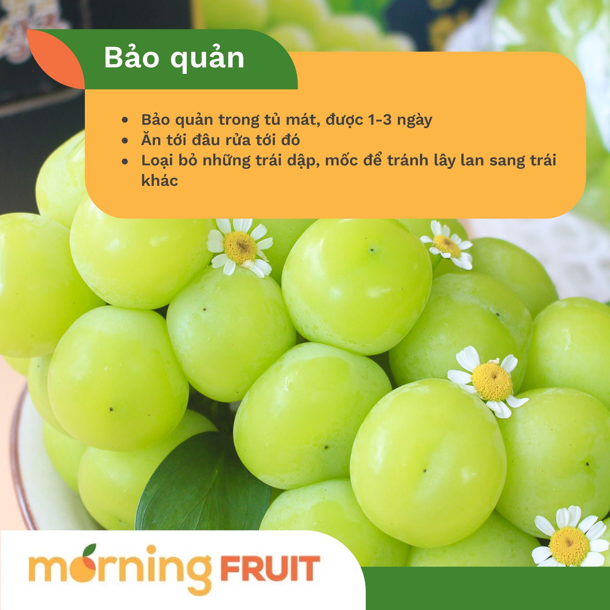 Bảo Quản Và Sử Dụng - Nho Mẫu Đơn mua về, nếu không sử dụng ngay nên bảo quản ngăn mát tủ lạnh trong khoảng từ 1-3 ngày. - Không nên rửa nho mẫu đơn trước khi bảo quản. Ăn tới đâu, rửa tới đó để bảo đảm chất lượng tốt nhất của trái. - Loại bỏ những trái hư, dập, mốc, để tránh lan sang những trái bình thường khác.