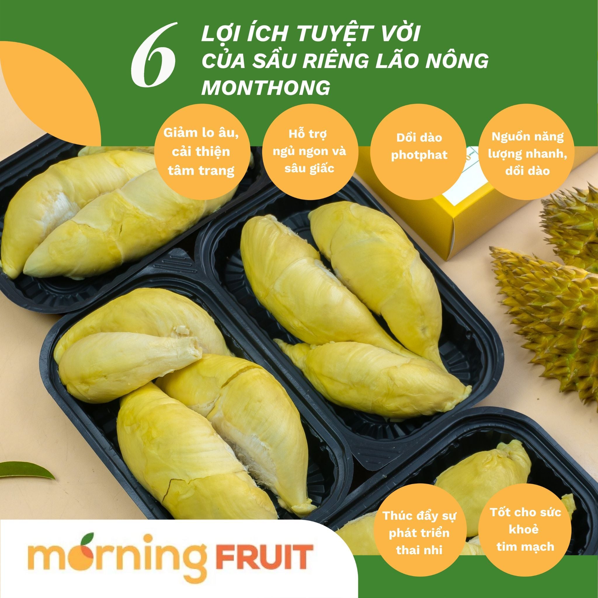Lợi Ích Của Sầu Riêng Thái Monthong - Giảm âu lo, cải thiện tâm trạng - Hỗ trợ ngủ ngon và sâu giấc - Dồi dào photpphat - Nguồn năng lượng nhanh, lành mạnh - Thúc đẩy sự phát triển thai nhi - Tốt cho sức khoẻ tim mạch